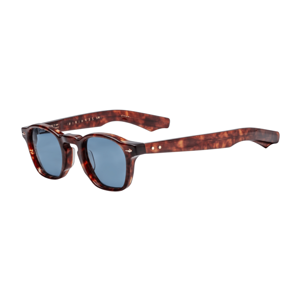 The Jacques Marie Mage Zephirin Eyeglasses are manufactured in small batches from 10mm premium Japanese Acetate. These thick-gauge acetate frames feature – triple spur rivets, core wire detailing and JMM’s signature arrowhead front pins.